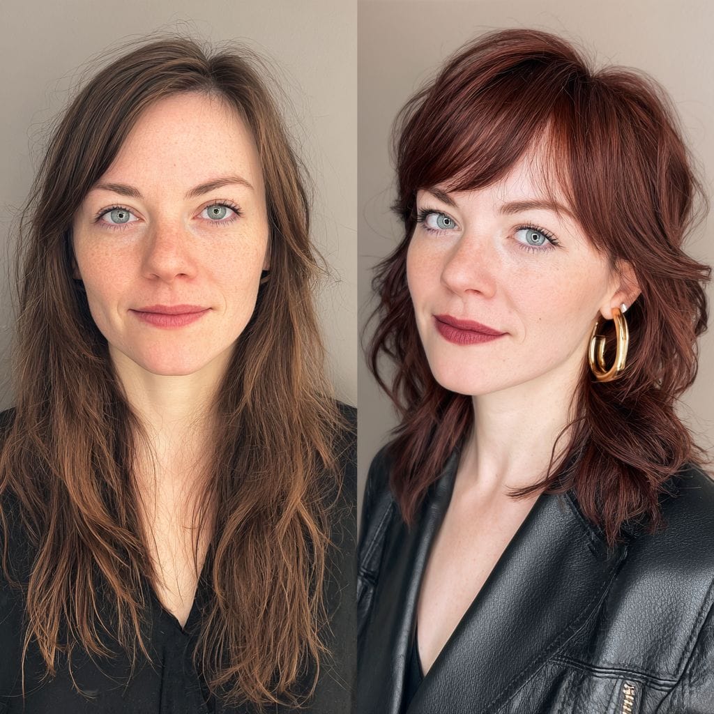 This soft mullet features textured layers that add movement and volume, perfect for fine to medium hair types. The face-framing layers enhance a variety of face shapes, providing a fresh, youthful look. The rich auburn color highlights the texture beautifully, making it a standout choice. While this cut is easy to style with a bit of mousse for added body, it may require regular maintenance to keep those layers looking sharp. A great option for those wanting a modern twist without the fuss of high-maintenance styles!