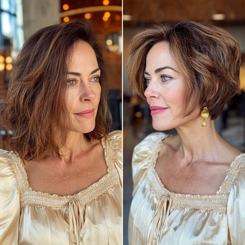 This chic neck-length bob features soft bangs and a textured finish that beautifully frames the face. Ideal for fine to medium hair types, it adds volume without overwhelming the features. The subtle layering gives movement while ensuring that styling remains easy, perfect for busy lifestyles. However, keep in mind that the bangs may require regular trimming to maintain their shape. This cut works wonderfully with various face shapes and is especially flattering for those looking to rejuvenate their look while keeping maintenance low.