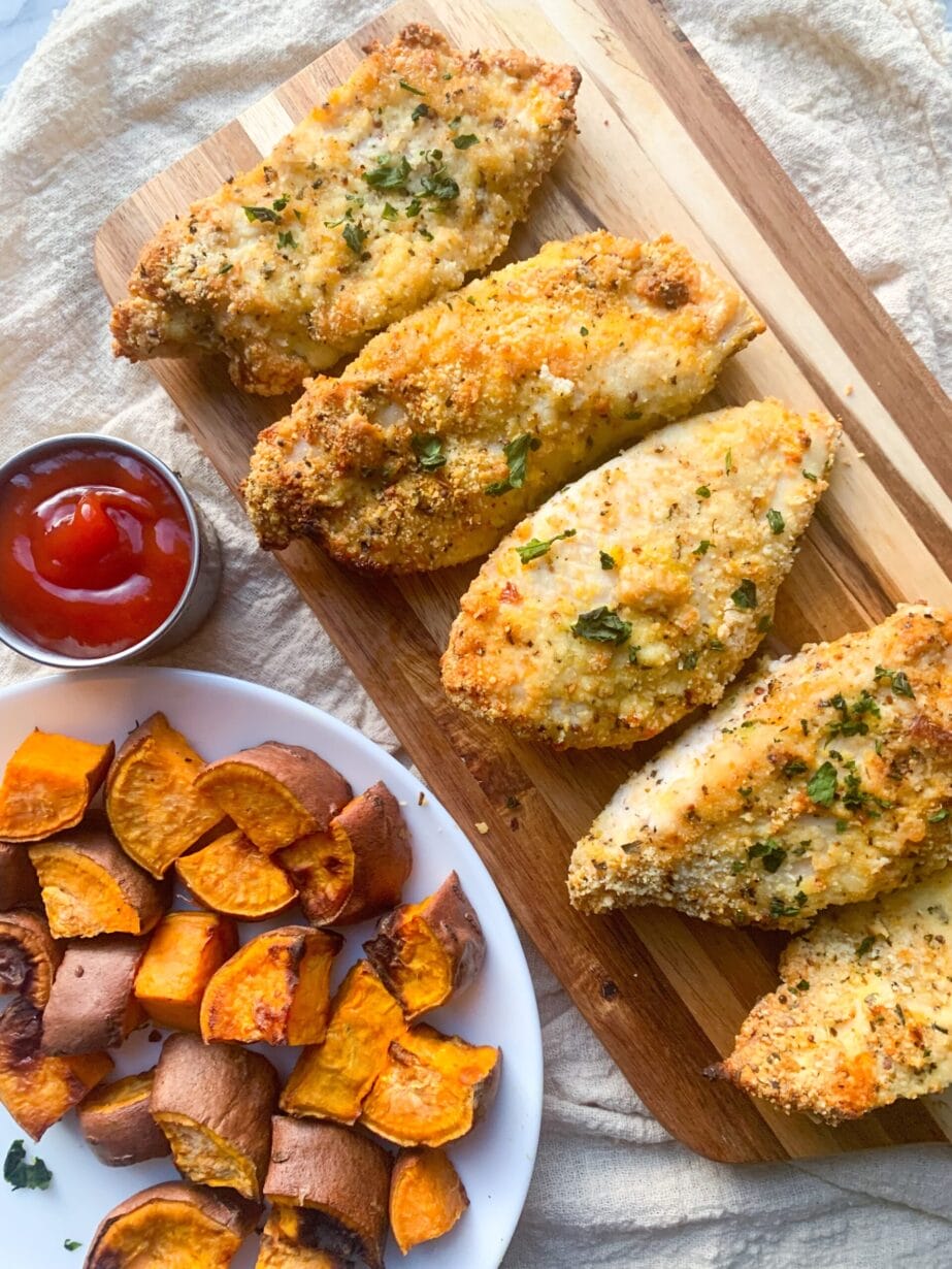 Serve and Enjoy: Serve these oven baked chicken tenders warm with your favorite dipping sauce, like honey mustard or a light ranch!