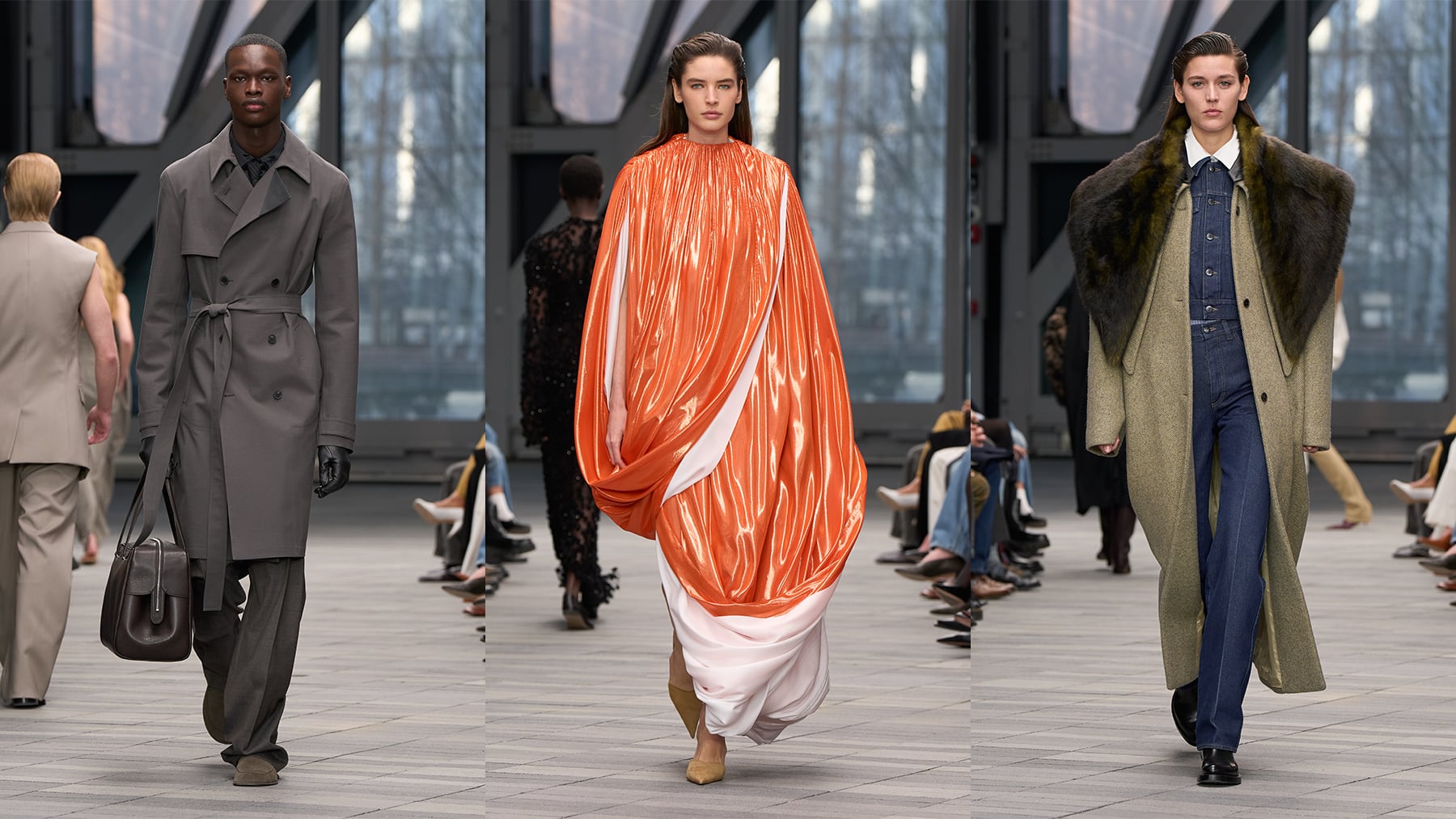 It’s worth wondering if — particularly to position the collection for commercial success — there isn’t more to be done to tie Collection to the products that most consumers know and love. The show overall leaned much more heavily on suiting, tailored dresses and coats in muted grays, whites, browns and blacks. There was some colour: a translucent-appearing red leather trench coats, a burgundy leather set, and a bright orange finale dress that billowed down the runway.