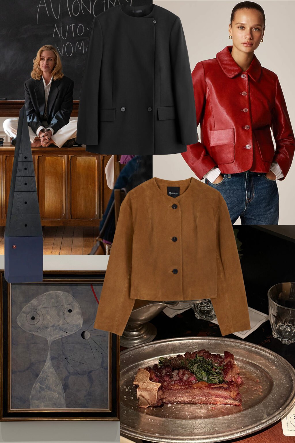On the softer side, this Toteme satin dinner jacket fits squarely into my minimalist sweet spot. This COS collarless blazer and suede long coat echo that same energy, while this Soeur wool hoodie is that rare mix of cozy and cool that makes getting dressed in cold weather actually fun.