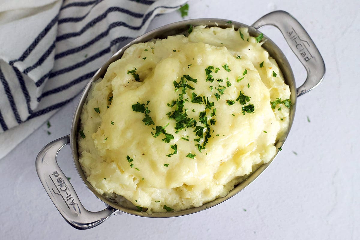 mashed potatoes in a silver all clad container.