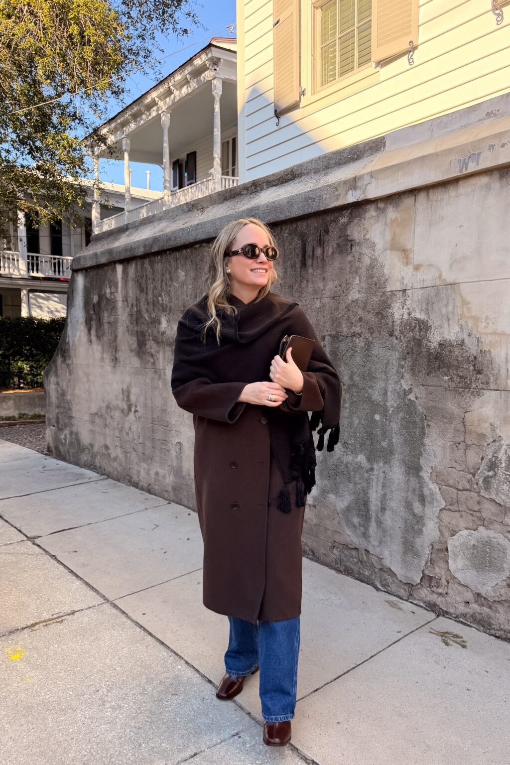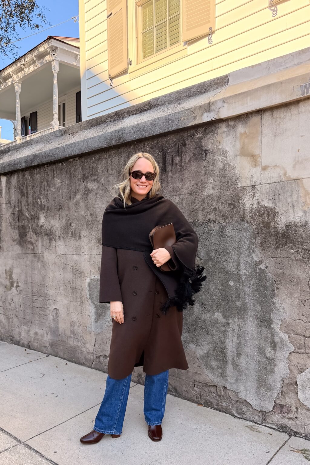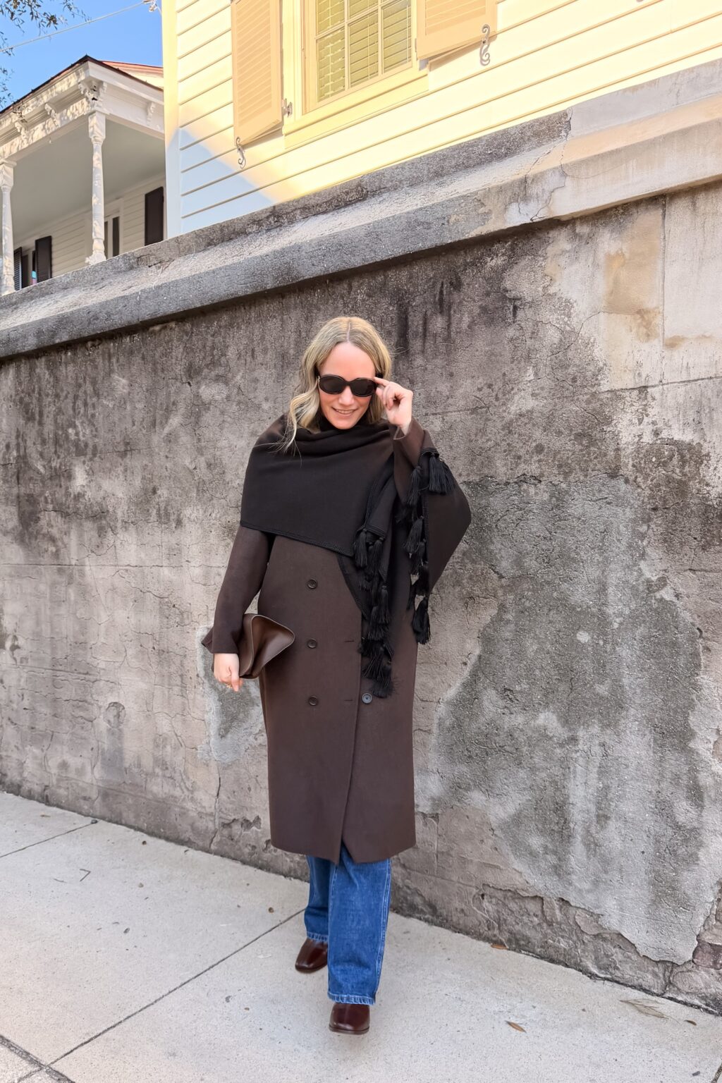 Outfit details above: Alex Mill Coat (sold out, but this is similar), Khaite Jeans, Sezane Boots, Attersee Scarf (here is a good affordable alt!), The Row Clutch, Celine Sunglasses