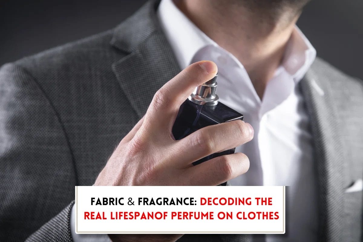 A man spraying perfume on formal attire and text indicating, "How long does perfume last on clothes?"