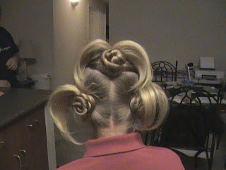 Curl the top pony so it falls on each side and curl the other two just under and back brush a little to add a little extra poof, spray good and your done!