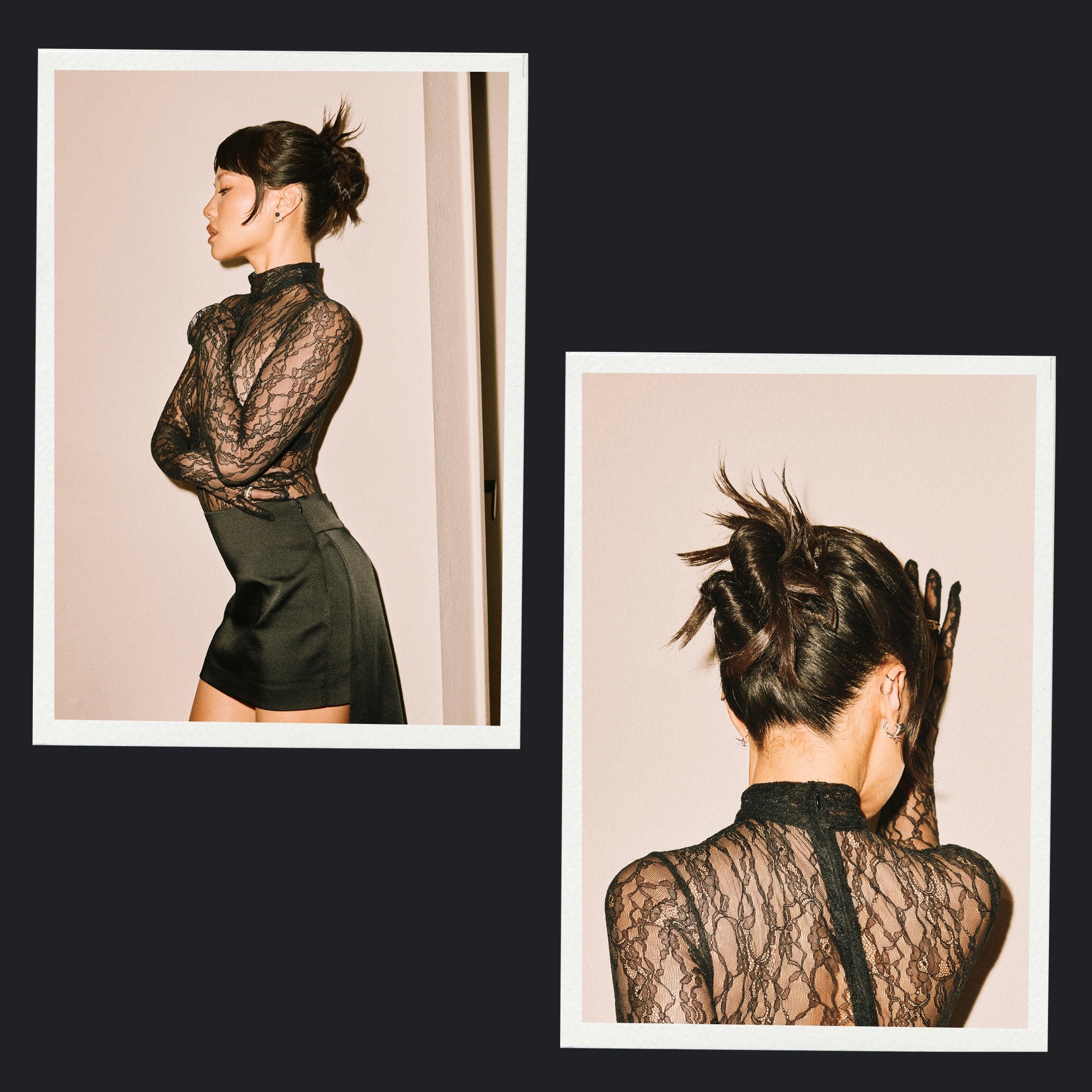 Together, the two sections formed a figure-eight silhouette, creating a sculptural shape with visible ends for an editorial finish.
