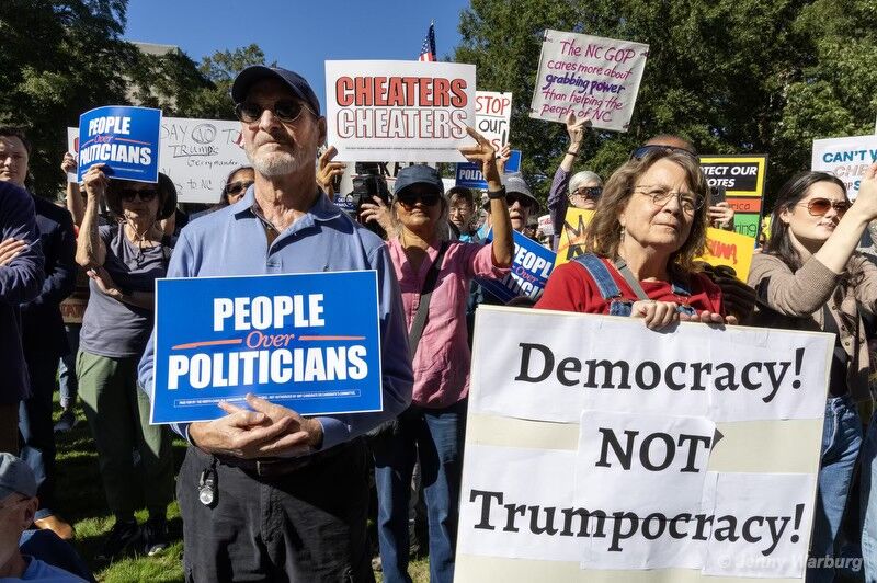 A rally in support of North Carolina Supreme Court Justice Allison Riggs in Raleigh, N.C., on Feb. 16, 2025. Common Cause organized several large rallies, part of their “The People v. Griffin” campaign, across the state to defend over 65,000 voters that Riggs’ competitor Jefferson Griffin attempted to discount. (Jenny Warburg)