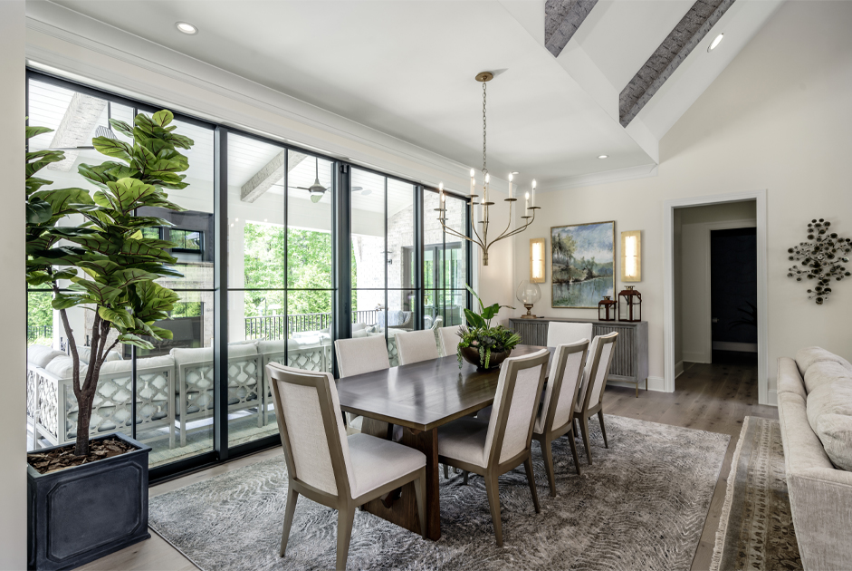 “We were excited to continue the project at East Bend after remodeling their kitchen and flex room in 2023. Next came the front four rooms of their home: the foyer, dining room, living room and sunroom. We spent three months creating what we thought would seamlessly bring the aesthetic of the kitchen into those other spaces. During this “Elegant Escape” project, the sunroom is where we got our hands dirty with construction, as our goal was to transform the space into a retreat, with the tranquil view of their backyard. We replaced doors, windows and rounded transoms with wider and taller doors, and opened up the fireplace to be able to see through to the living room, allowing for a more harmonious flow. The existing stone floors were kept intact to mirror the front porch, leaning once again into a cohesive design that brought the project together. While these changes were made to create a more timeless aesthetic within the space, some modifications were necessary due to broken seals and weathered exterior trim work on doors and windows.”
