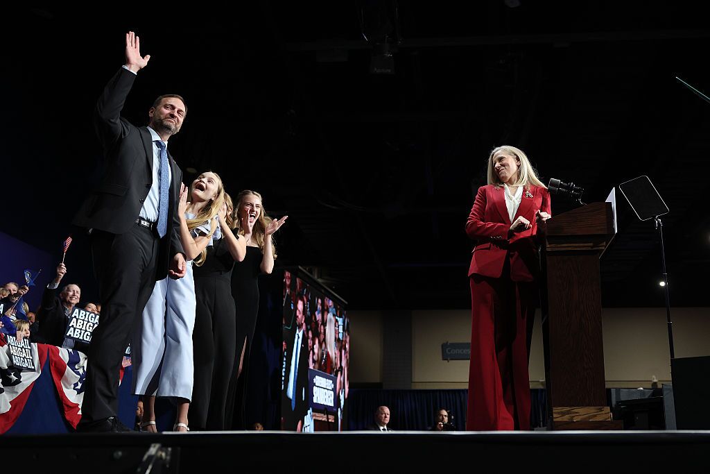 Gov.-Elect Rep. Abigail Spanberger with her husband Adam and children, Catherine, Claire and Charlotte, during her Election Night rally at the Greater Richmond Convention Center on Nov. 4, 2025 in Richmond, Va. Spanberger defeated Republican gubernatorial candidate Lieutenant Gov. Winsome Earle-Sears to become the first female governor in the commonwealth’s history in an election that was seen as a national political bellwether leading into the midterms. (Win McNamee / Getty Images)