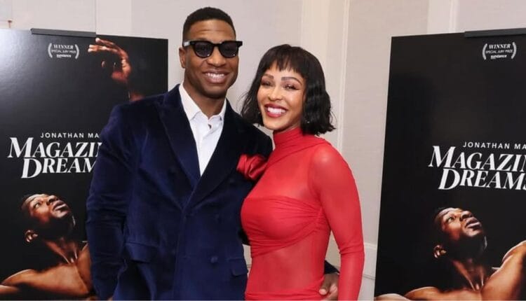 Meagan Good Posed with Her Husband Jonathan Majors in a Red Do Long Official Dress at the ‘Magazine Dreams’ Screening