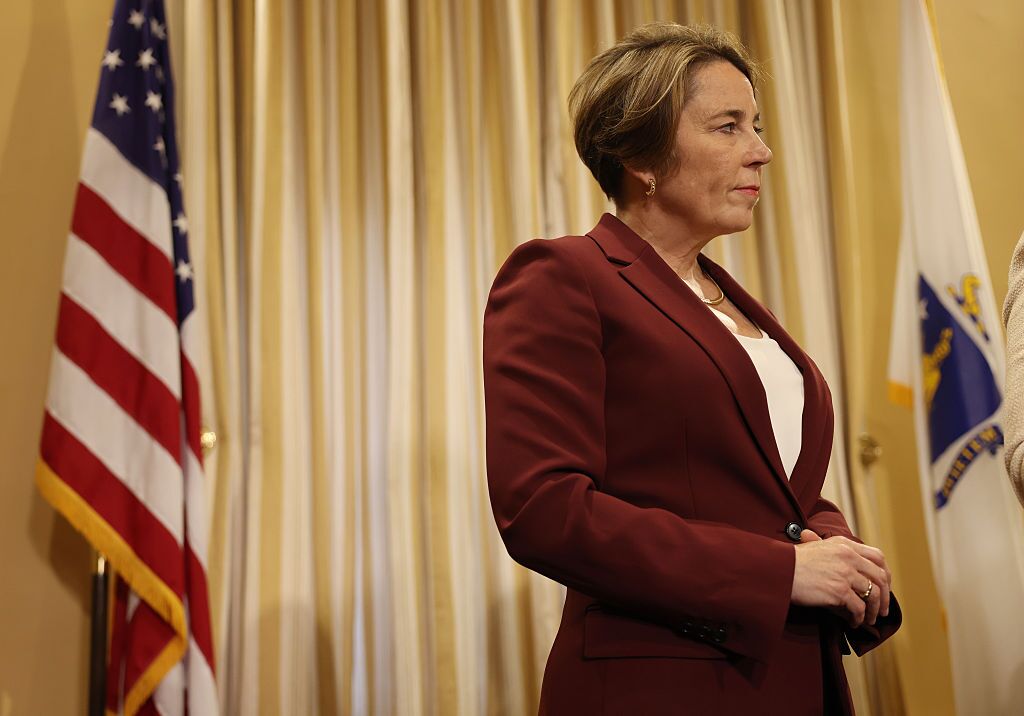 Massachusetts Gov. Maura Healey listens to a speaker during a press conference held to provide an update on SNAP and rising health care costs at the State House on Nov. 10, 2025. (Jessica Rinaldi / The Boston Globe via Getty Images)