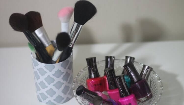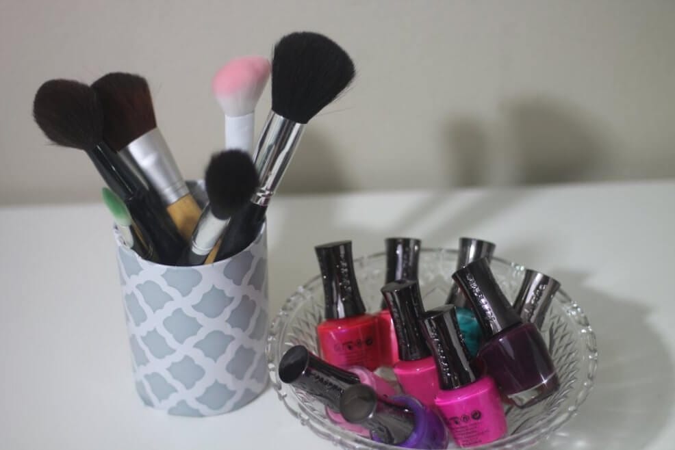 For makeup, I use a lot of different makeup bags and totes. I keep all of my foundation in one makeup bag, I use plastic and acrylic makeup holders for my lipsticks, lip pencils, mascara, and other beauty essentials. For my brushes, I re-purpose candle holders by wrapping them in printed shelf paper and adding decorative stones.