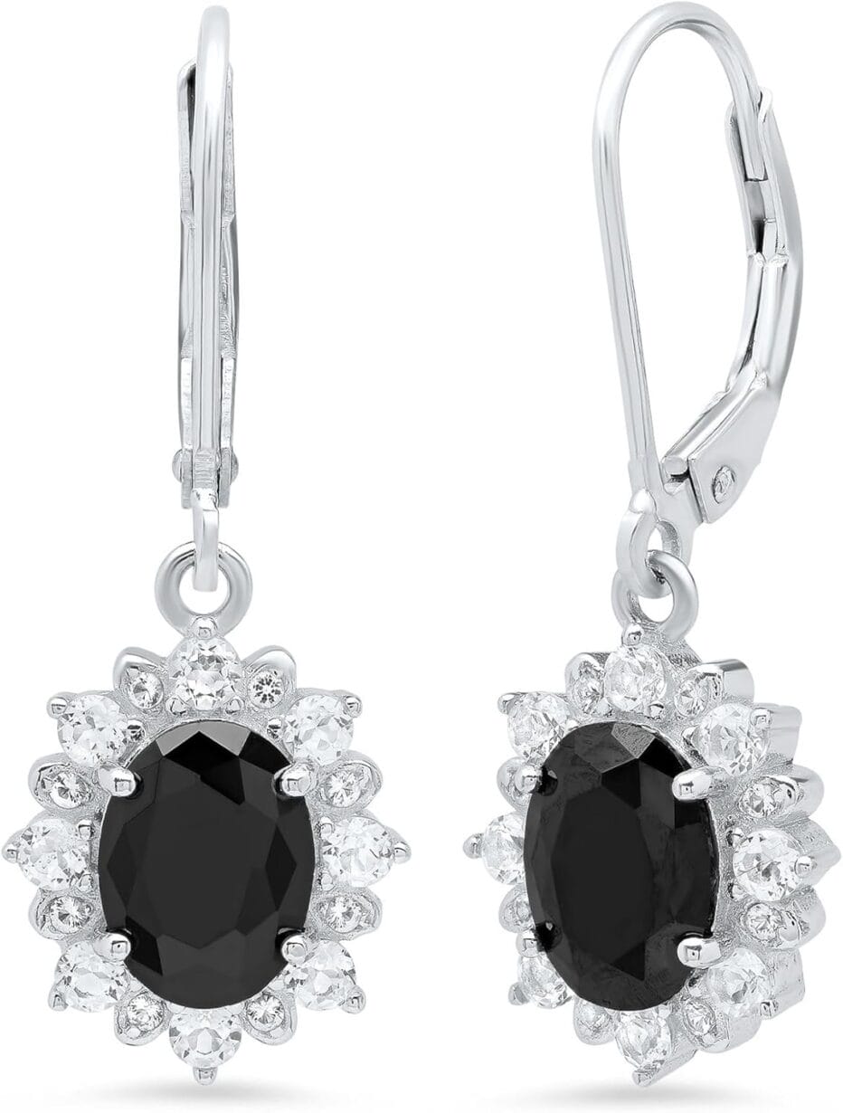 925 Sterling Silver Halo Sunburst Gemstone Oval Dangle Earrings for Women 8x6mm Birthstone with Leverback White Topaz Accent Stones by MAX + STONE