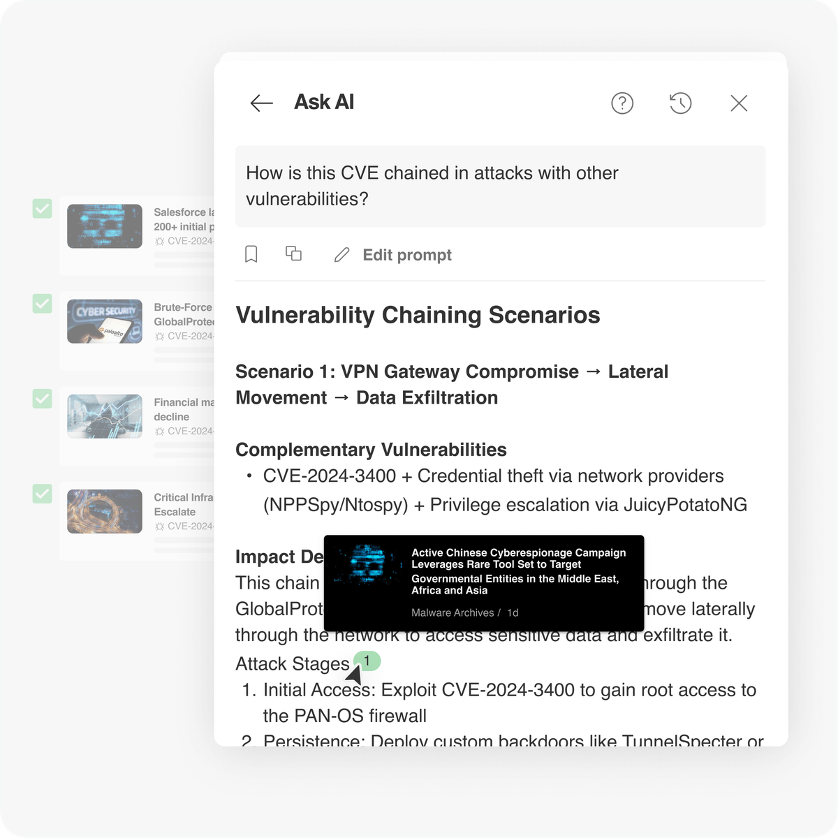 One vulnerability might not bring your organization down, but when chained with others, it can create critical risks, often catching defenders off guard. At Feedly, we built CVE Insights Cards to give you a complete view of critical vulnerabilities. Now, with Ask AI in CVE Insights Cards, CTI teams can dive even deeper: asking targeted questions around specific CVEs, exploring their chaining potential, and identifying hidden exploitation paths, which is exactly what this new prompt is designed to help you uncover.