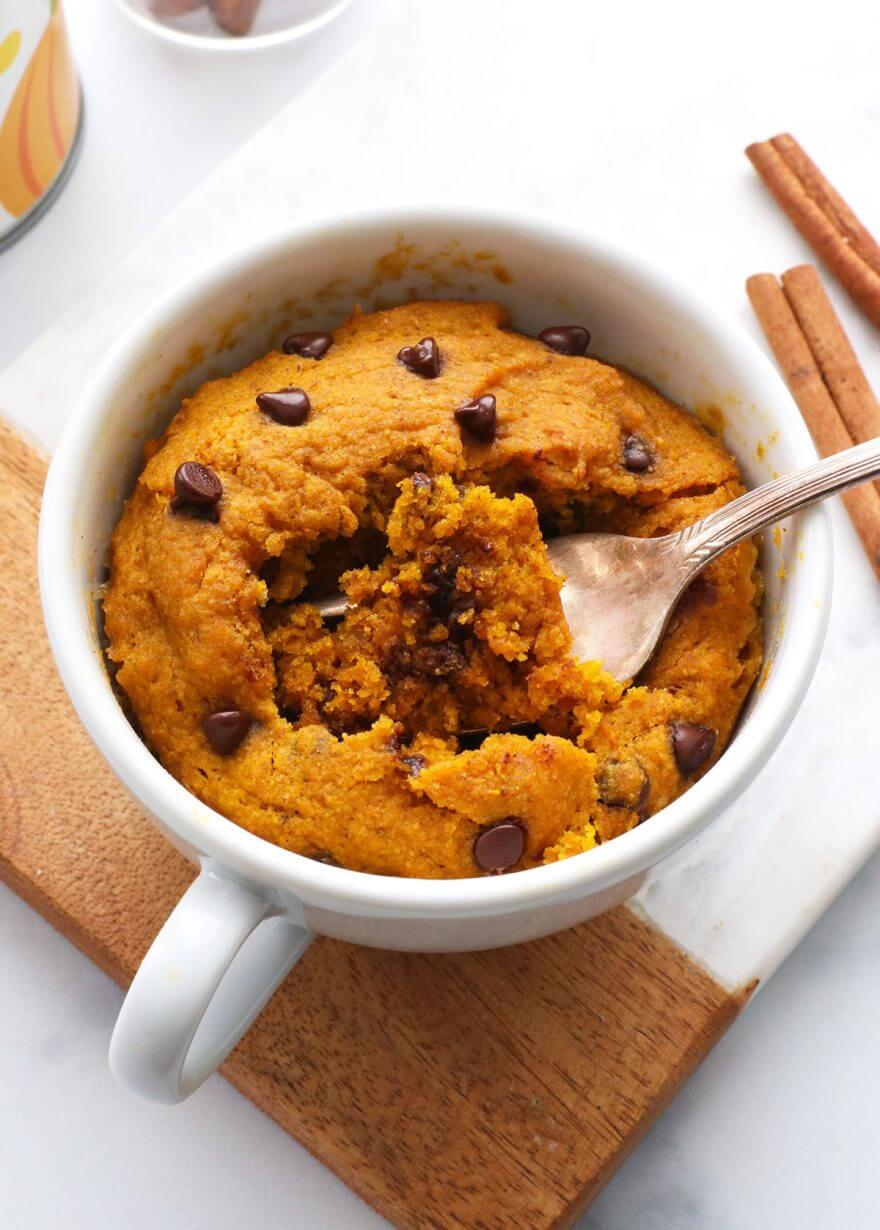 Lightly sweetened with maple syrup, this mug cake tastes like a not-too-sweet piece of pumpkin bread. Add a few chocolate chips, and it will satisfy a craving in minutes.