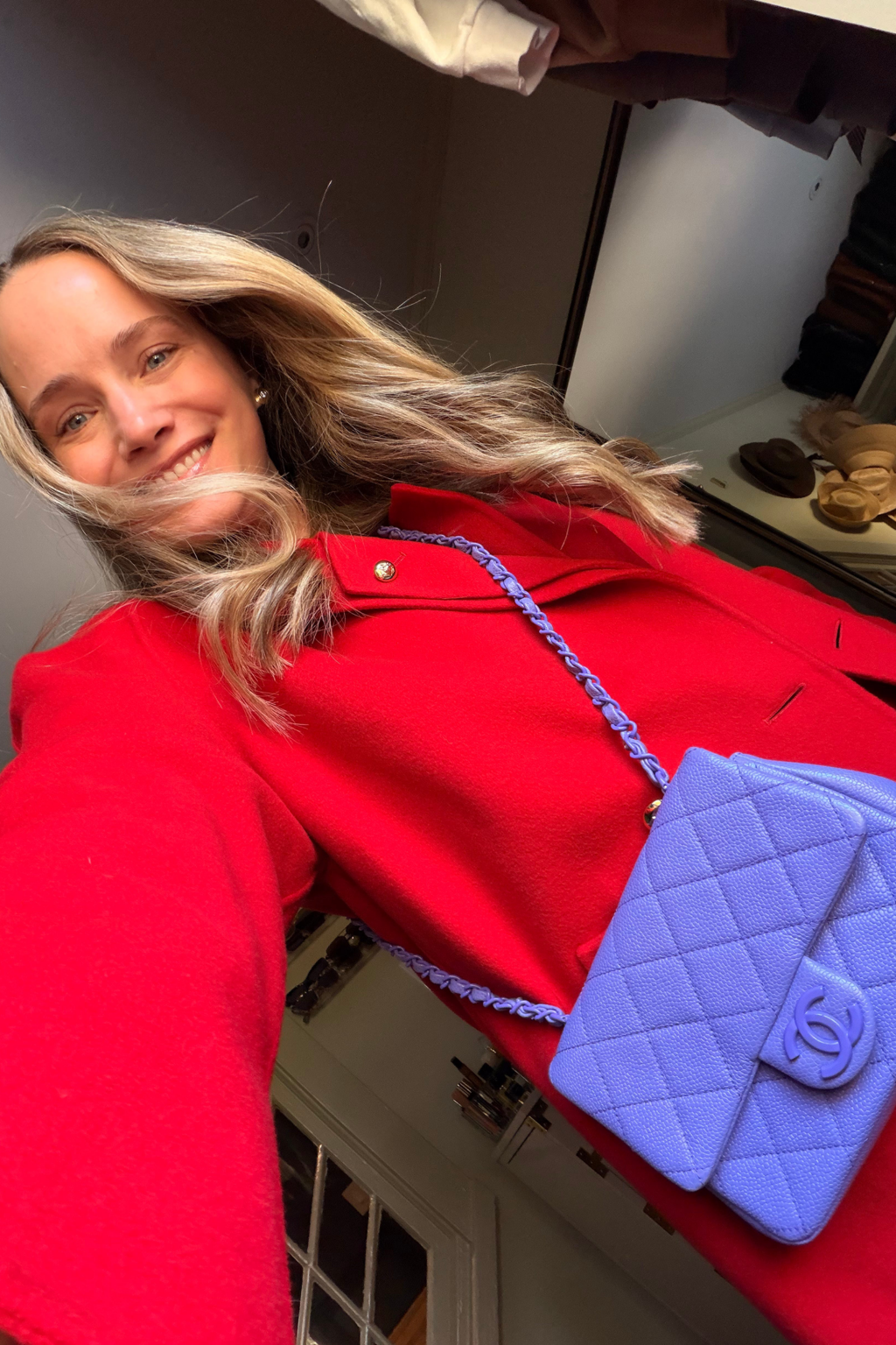 One color combo I love right now is red and purple. It feels very fresh and fun . . . less predictable than red and blue (and besides, purple is having such a moment right now!) I borrowed this purple Chanel bag from Vivrelle and had so much fun mixing it in with other colors in my wardrobe. Yellow, aqua, and chartreuse were all winning complements, but red and purple was far and away my favorite combination.