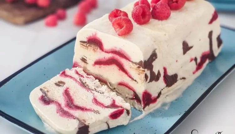 As it freezes, the flavors settle into soft, marbled streaks of red and dark chocolate through the pale vanilla base. When sliced, it reveals a beautiful contrast, creamy white layers streaked with raspberry swirls and glossy chocolate ribbons. It looks like something from a pastry shop but it comes together right in your kitchen.