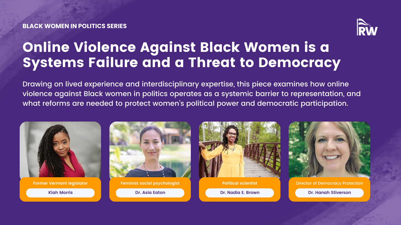 That reality is at the center of our latest installment of the Black Women in Politics series, released at the end of last month. Through in-depth conversations with former Vermont State Representative Kiah MorrisDr. Nadia E. BrownDr. Asia Eaton and Dr. Hanah Stiverson, we set out to understand how digital abuse, institutional inaction, and outdated legal frameworks converge to push women, especially Black women, out of political life. These conversations were honest, difficult and deeply illuminating. Together, they make clear that online violence is not an individual problem to be endured, but a system failure that depletes our leadership pipeline and weakens democracy itself.