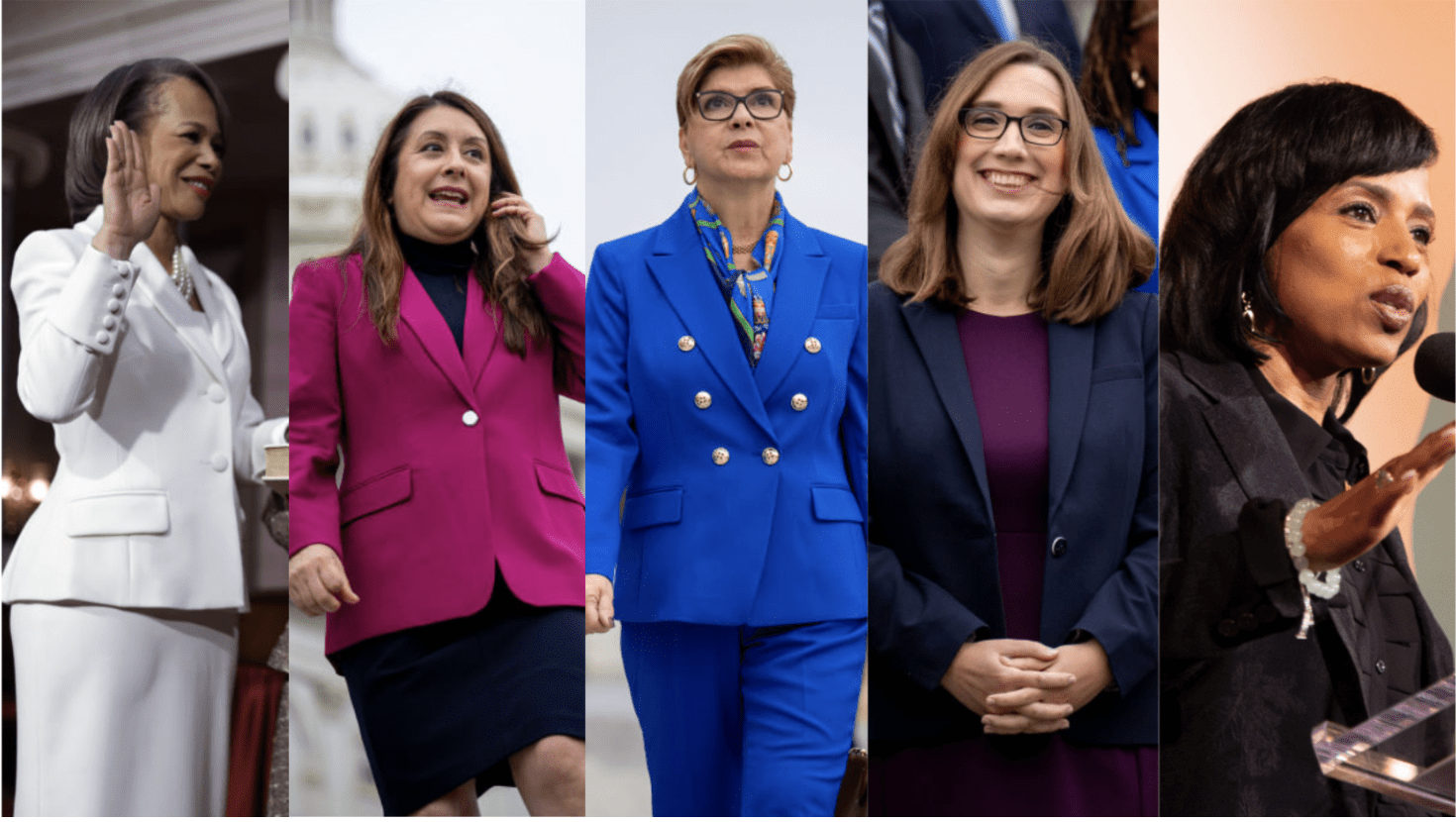 Some of the U.S. women elected to Congress in 2024. (art by Ms. magazine; Alex Wong and Andrew Harnik / Getty Images; Jenny Warburg)