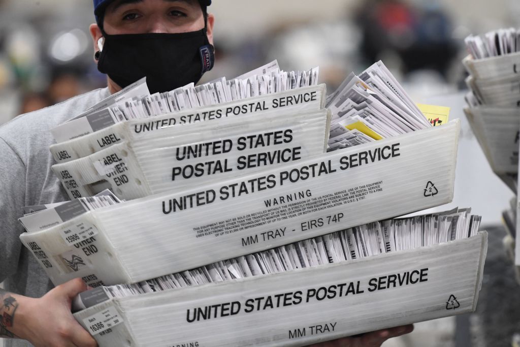 Mail-in ballots for the U.S. presidential election are sorted at the Los Angeles County Registrar Recorders’ mail-in ballot processing center at the Pomona Fairplex in Pomona, Calif., on October 28, 2020. (Robyn Beck / AFP via Getty Images)