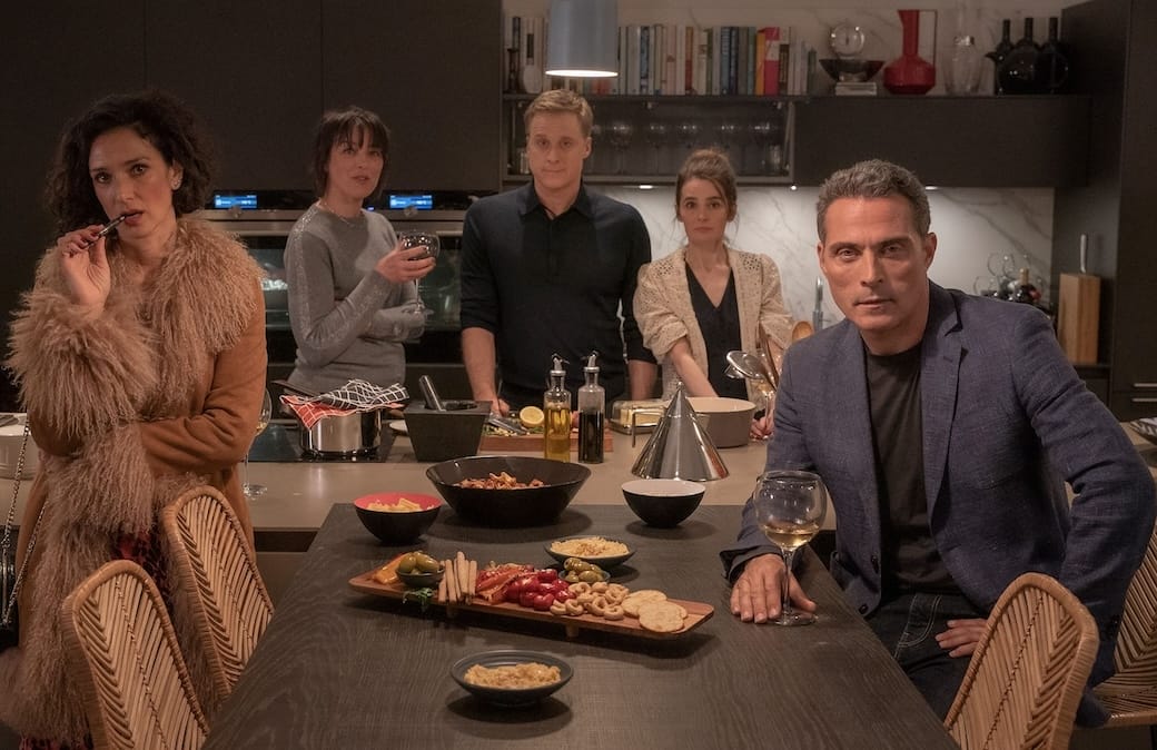 The dark comedy begins with a seemingly well-to-do couple (Scottish actress Shirley Henderson and American actor Alan Tudyk) who are on the brink of bankruptcy. Since they must sell their stylish London home to financially survive, the two decide to host a final hurrah with married friends (The Father co-stars Rufus Sewell and Olivia Williams) from college. But the dinner party quickly turns into a literal last supper when Jessica (Indira Varma), their ill-fated alum, unexpectedly arrives only to make the ultimate exit in their garden.
