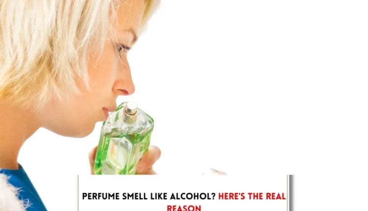 Woman smelling prfum and text indicating, "why does my perfume smell like alcohol?"