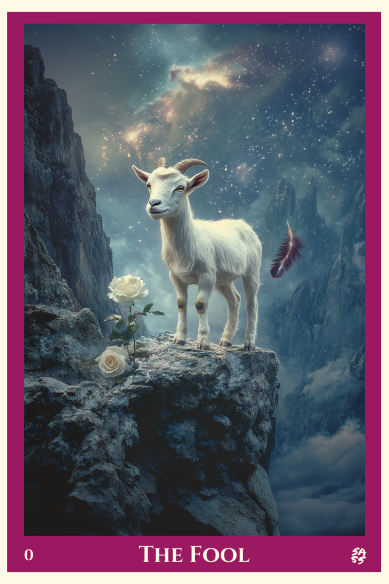In our featured image, a curious young goat stands at the edge of a cliff, one hoof lifted like it might just jump. At its feet: a white rose symbolizing purity of intention. Floating above: a feather representing untapped collective wisdom. The moment is electric—not reckless, but ripe with potential.