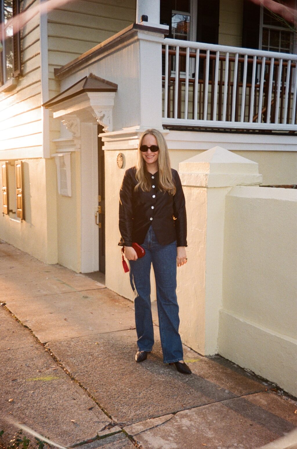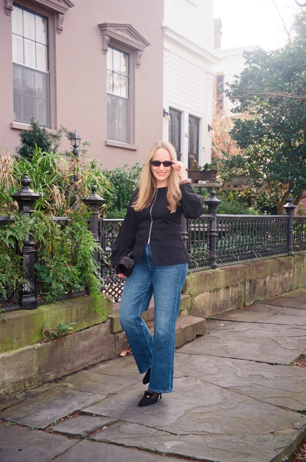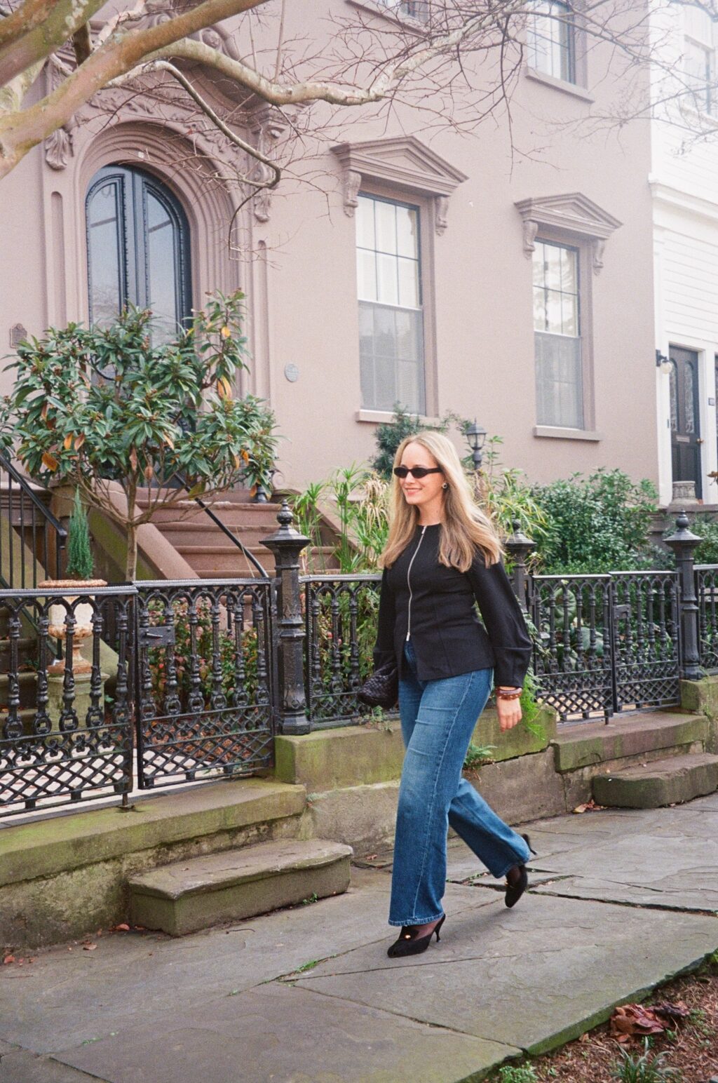 Outfit details: Donni Jacket (I wear the medium!), Khaite Jeans, Marlies Grace Clutch, (old) Loeffler Randall Pumps, Celine Sunglasses