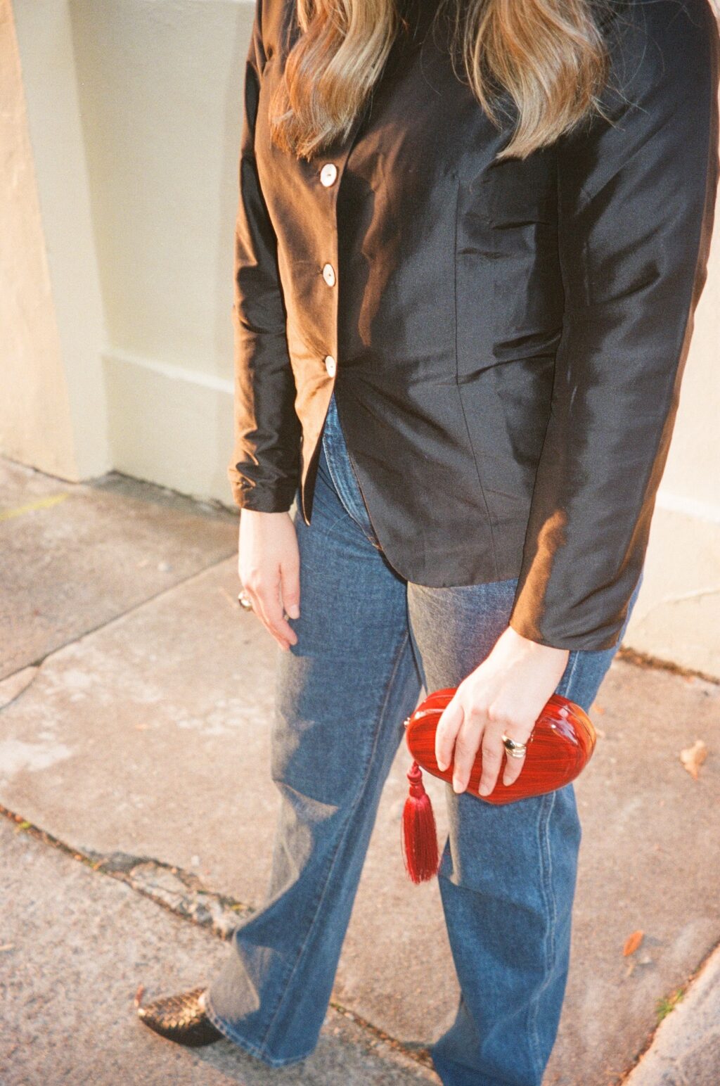 Oh man, do I love a lady jacket. I’ve always loved a fancy little jacket, but as I get older, I find that wearing it with jeans feels the most me. Also, now, staunchly in my mid-forties, they look a little less ironic and “cool” than they did in my twenties and thirties. So pairing a more conservative-looking jacket with denim and an interesting accessory helps keep the look fresh and fun vs. matriarchal or stuffy. In the look above, it’s the red tassel clutch. For the second look, it’s sheer socks and an interesting shoe.