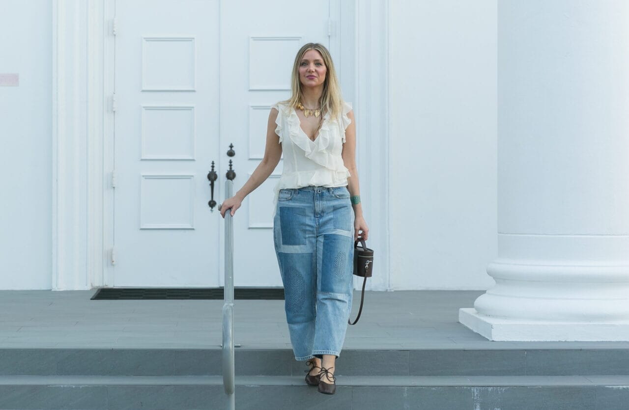 For this look, I leaned into the soft, feminine-meets-structured styling. I paired these patched jeans with an affordable white ruffle blouse by Open Edit (it’s under $50 and also comes in black and a gorgeous pink ‘abstract watercolor’ print option). I think the feminine ruffles help balance the ruggedness of the patched denim.