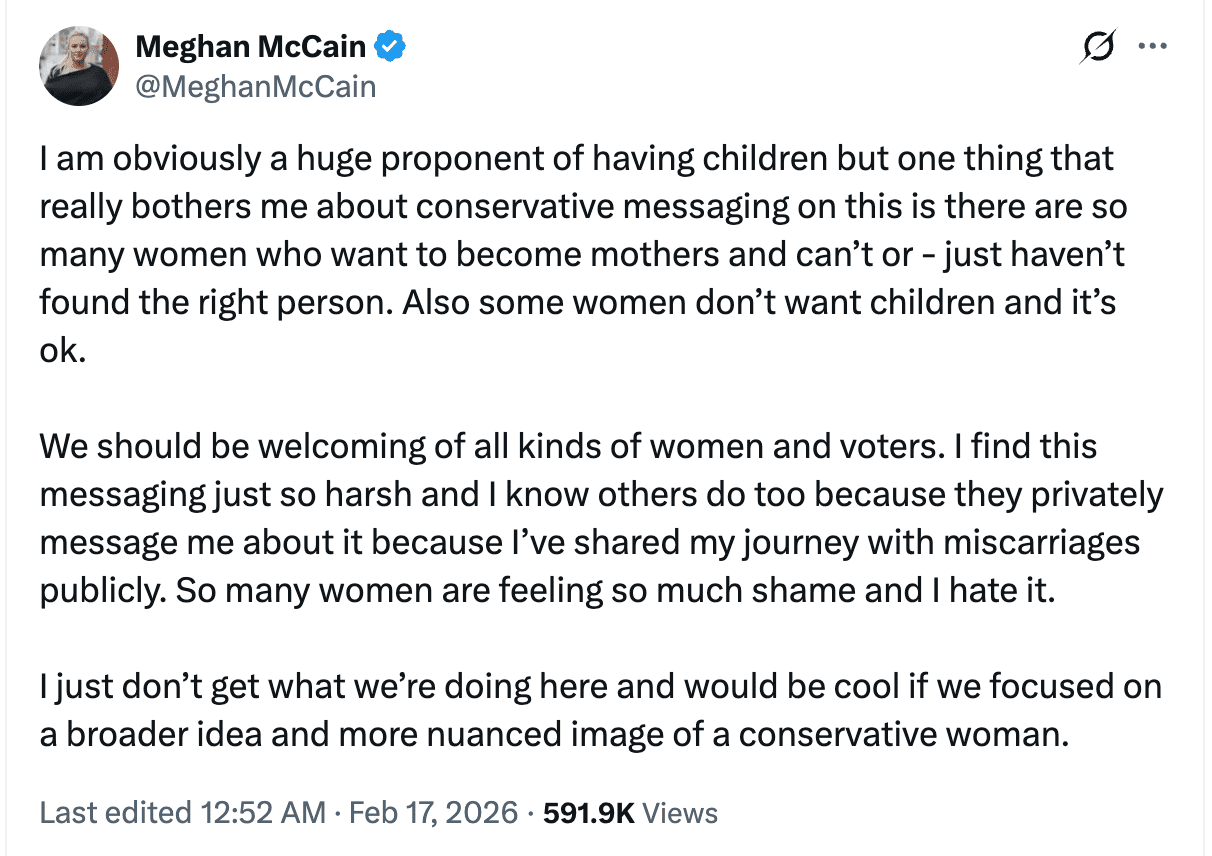 And it’s not just Heritage: Some of the most prominent thinkers (“thinkers”) of the New Right are obsessed with increasing (white) birthrates, and the curtailments of women’s freedoms that would be required to get reproduction to where they want it (infinite). Many of these “thinkers” are terminally online brain-rotted misogynists, but they have heavy sway over the terminally online brain-rotted men currently running the U.S. government. (If they’re asking Claude how to invade Venezuela and capture Maduro, they’re definitely turning to Bronze Age Pervert for his thoughts about women’s rights.)